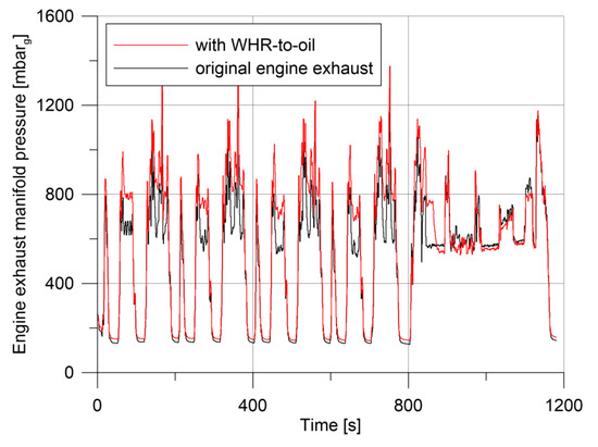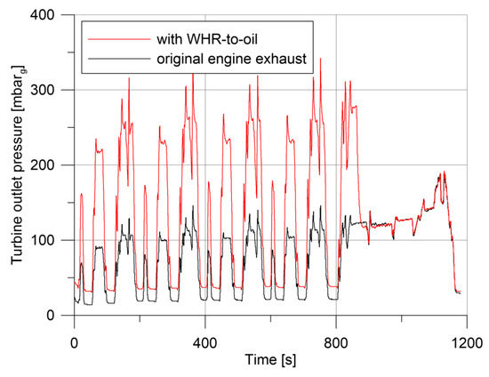 The greater constraint of the WHR section is the pressure drop increase realized in the exhaust line and, therefore, the backpressure effect on the engine itself. In Figure 16, the gauge pressure at the turbine outlet is shown. The pressure increase due to the presence of the WHR heat exchanger presents peaks in the range of 100–200 mbar depending on gas flow rate, with an average value of 75 mbar. When WHR section is deactivated (bypass branch is opened at 900 s), the turbine backpressure comes back to the original value as Figure 16 shows.