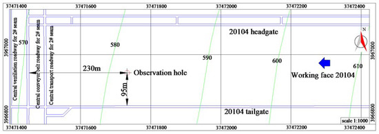 Working face 20104 at the Wangjialing coal mine is the first coal face in the 2# coal seam, from which the coal is extracted by fully-mechanized top-coal caving. It is 230 m wide and 1214 m long in its advance direction. The surface elevation ranges from +803 m to +953.9 m asl, and the elevation of the 2# coal seam is between +579.3 m and +614.4 m asl. This seam has relatively uniform properties and distribution across this mine. It dips at 2° to 4°, and is 5.91 m to 7.77 m thick, with an average thickness of about 6.84 m. The mining height is 6.2 m. The layout of working face 20104 is shown in Figure 1.