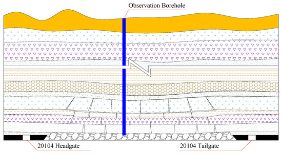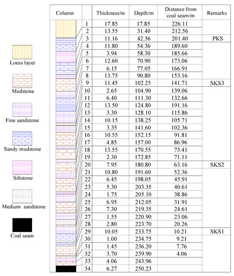 An observation hole was made into the surface above working face 20104 for observing the height of the CFZ by borehole imaging (Figure 2). The observation hole was 230 m from the central transport roadway for 2# seam and 95 m from 20104 tailgate, as shown in Figure 1. This hole is about 250 m deep and its mouth at the surface has an elevation of +829.9 m. The positions of key strata in the overburden were identified using KSPB, software for locating key strata (the computational method of this software is based on the key Strata theory and the identification of KS) [25,26]. It was found that there are four key strata above working face 20104, including a PKS and three secondary key strata (SKS) (Figure 3).