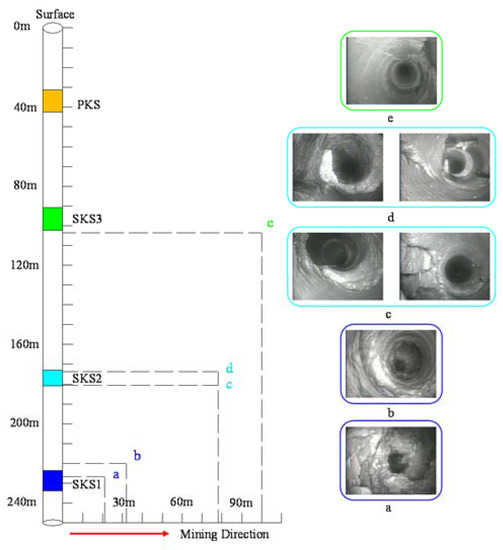 A TYGD10 borehole camera was placed into the observation hole to observe the deformation of the hole wall. The images it produced are presented in Figure 4. When the face was about 21 m in front of the hole, the wall rock at a depth of 226.6 m from the mouth (SKS 1) caved in and blocked the hole (Figure 4a). At this point, the height of the caved zone was 17.26 m. When the face was 32 m ahead of the hole, the wall rock caved in at a depth of 220 m and the height of the caved zone reached 23.96 m (Figure 4b). Later, the vertical extent of the caved zone did not increase significantly and the strata above it showed noticeable fractures. Bed separations occurred at positions that were slightly lower than SKS 2. As the working face further advanced, bed separations, vertical fractures and horizontal fractures continued growing upward. As the face reached 78 m in front of the observation hole, SKS 2 failed due to the occurrence of bed separations and vertical fractures, and the hole wall deformed significantly (Figure 4c,d). When the distance between the hole and the face increased to about 100 m, a vertical fracture was observed at a depth of 103.5 m (Figure 4e), and the wall rocks ranging from 103.5 m to 125 m in depth were fractured to a much lesser extent. At this point, the height of the CFZ was 140.46 m. As the distance further increased, the height of the CFZ did not change obviously and ultimately reached its maximum, 148 m, a level close to the bottom of SKS 3.