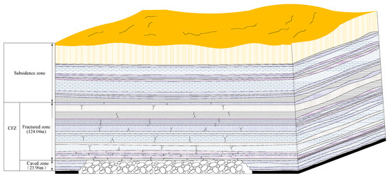The field measurements reveal that the CFZ in the overburden of working face 20104 at the Wangjialing coal mine was about 148 m high, 23.87 times greater than the mining height. As Figure 5 shows, the CFZ can be divided into two zones: a 23.96 m high caved zone (3.86 times the mining height) and a 124.04 m high fractured zone (20.01 times the mining height). It is worth noting that the measured height of the CFZ at working face 20105 ranged from 141.6 m to 163.1 m, or 22.84 to 26.31 times the mining height [17], which is similar to that measured at working face 20104. Later, the empirical formula shown in Equation (1) was used to calculate the CFZ’s height for the conditions of working face 20104: