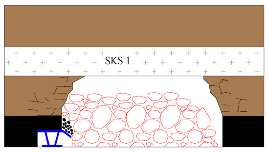 The vertical distance from SKS 1 to the coal seam at working face 20104 is 10.21 m. Before SKS 1 fractured, the immediate roof below it caved in to the goaf. The bulking factors of caved rocks in goaf normally fall within the range of 1.1 to 1.30. For a bulking factor of 1.30 and mining height of 6.2 m, the height of the free space below SKS 1 was ∆ = 3.14 m. It is clear that this space was large enough to allow for SKS 1 to fracture and fall as the face advanced (Figure 6).