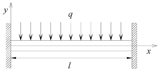As the immediate roof collapsed into the goaf during mining, the span of exposed KS in the advance direction of the face gradually increased. Therefore, an unfractured KS can be simplified to a clamped-clamped beam structure that is inserted into the surrounding rocks at both ends. Figure 6 illustrates the state of unfractured SKS 1 exposed by the collapse of the immediate roof of working face 20104 and the corresponding clamped-clamped beam model is shown in Figure 7.