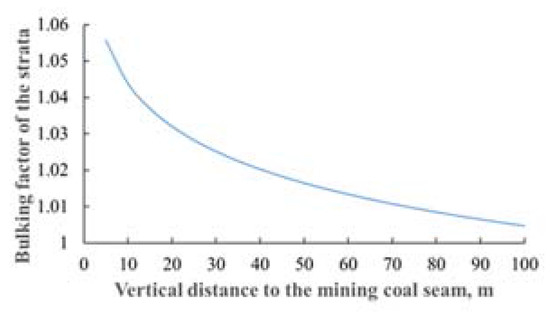 The HoL analysis reveals that for given geological conditions (relative locations of KS) and mining height, the HoL between KS depends on the bulking factors of the strata in the fractured zone. According to the field measurements from working face 20104, the strata within the fractured zone did not cave in and its behavior was characterized by fracturing, bed separation and displacements parallel to bed planes. This enables the strata in this zone to retain the original layered structure. It is reasonable to infer that the strata within the fractured zone did not increase in volume significantly and their bulking factors should be much lower than those of strata in the caved zone. In the vertical direction, the bulking factor of a stratum in the fractured zone tends to decrease logarithmically with the distance from the coal seam. Equation (8) describes the relationship between the bulking factor of the strata within the fractured zone measured at Yangquan No.1 mine and the vertical distance to the mining coal seam [27], and the graph of the equation is shown as Figure 9.