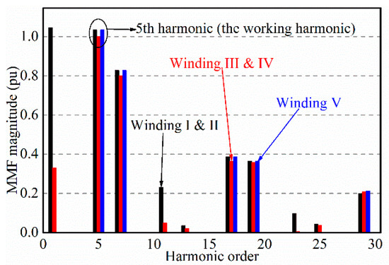 In Figure 1, it can be found that there is only one kind of six-phase winding configuration (Winding II) for a single-layer 12-slot/10-pole winding type, while there can be two different kinds of six-phase winding configurations for a double-layer winding type—symmetric six-phase (Winding IV) and asymmetric six-phase winding (Winding V). The symmetric six-phase windings with a 60-degree phase belt have electromagnetic features similar to a conventional 60-degree three-phase winding [33], as shown in Table 1. The symmetric six-phase windings (Winding II and Winding IV) possess the same winding factors and MMF distributions as the three-phase windings (Winding I and Winding III). For three-phase and symmetric six-phase windings, a double-layer winding type will lower the winding factor because the double layer winding will introduce an extra winding distribution factor. It should be highlighted that the content of MMF harmonics of 12-slot/10-pole asymmetric six-phase winding is almost half of the other four winding configurations. Moreover, its winding factor is not reduced, even though it is double-layer compared with the single-layer winding type. With the same ampere-turns, the simulated results of the MMF distributions of the five different winding configurations are obtained, as shown in Figure 2. For these 12-slot/10-pole machines, the 5th harmonic component is the working one and the others are all the undesirable harmonics. It can be seen that the main MMF harmonic orders of Winding I–IV are 1, 5, 7, 11, 13, 17, and 19 (satisfied with 6k ± 1 as shown in Table 1). For Windings III and IV, the magnitudes of the 5th harmonic (the working harmonic in a 5-pole-pair machine) are lower than the other three winding topologies because of their lower winding factors. But, Windings III and IV can greatly suppress the 1st harmonic compared with Windings I and II. As for Winding V, it not only produces a higher 5th harmonic, but also completely eliminates the 1st harmonic. With the aim of enhancing the quality of MMF distribution, Winding V is the best choice.