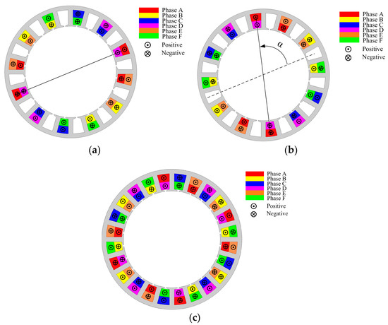 According to References [4,34], it can be found that for FSCWs, the most harmful MMF harmonics are those which are close to the fundamental harmonic (also called the synchronous harmonic in Reference [4]). Here, for a 5-pole-pair FSCW machine, the most harmful MMF harmonics will be the 1st and 7th harmonics, knowing that the fundamental harmonic is the fifth harmonic. Although Winding V can eliminate the 1st harmonic, the magnitude of the 7th one is still high, which will lead to serious PM eddy loss and then reduce the efficiency and increase the risk of irreversible demagnetization of the PMs. What is more, it will have a significant negative influence on the utilization of reluctance torque in a salient-pole machine. To cancel the 1st and 7th harmonics at the same time, the concept of stator shifting is employed, which is an effective way to suppress the undesirable MMF harmonics by using two FSCW stators with the same slot/pole combination to form a new stator. In this paper, due to its excellent stator MMF distribution, the concept of stator shifting is employed by 12-slot/10-pole asymmetric six-phase winding (Winding V), which implies that a 24-slot/10-pole machine with two sets of Winding V will be obtained, as shown in Figure 3. By increasing the coil pitch to two and doubling the number of the slots, two sets of Winding V can be placed in the new 24-slot stator. It should be noted that the 24-slot/10-pole configuration no longer satisfies the relation Q = 2p+/−2, so that its winding factor will significantly decrease if it still employs a tooth-coil winding (coil pitch equals 1).The second Winding V (as shown in Figure 3b) is obtained by shifting the first Winding V (as shown in Figure 3a) with a certain mechanical angle α. Different α results in different phase shifts between the two sets of windings which will lead to different winding factors and different stator MMF distributions.