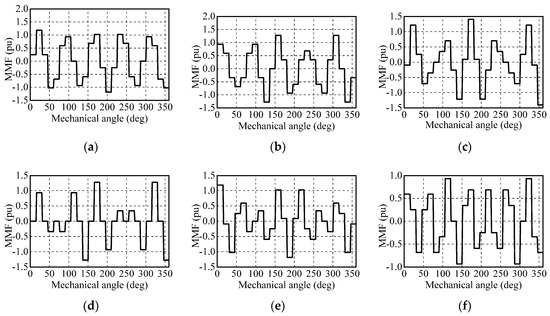 MMF distributions for different phase shifts between the two sets of 12-slot/10-pole windings: (a) 15°; (b) 45°; (c) 75°; (d) 105°; (e) 135°; (f) 165°.