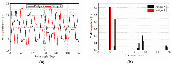 With the same rated currents, the stator MMF distributions and their corresponding harmonic spectra are obtained, as shown in Figure 8. Design B produces a higher 5th harmonic (working harmonic) owing to its higher winding factor (0.966), in comparison to that produced in Design A (0.958). Both machines can completely eliminate the 1st harmonic. The magnitude of the 7th harmonic of Design A is greatly suppressed, as analyzed above, while it is still very high in Design B. The different magnitudes of the 7th harmonic of the two different machines result in different harmonic leakage inductances, which will finally make a difference to the reluctance torque outputting capacity.