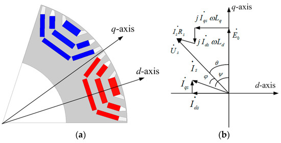 d-q axis and phasor diagram in PMA-SynRM: (a) d-q axis definition; (b) Phasor diagram.