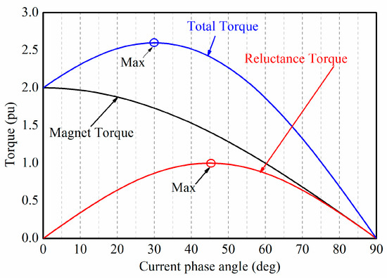 In (5), it can be seen that the electromagnetic torque constitutes three components: the first component is the magnet torque, the second component is the reluctance torque, and the third component is the copper loss. Here, aiming at investigating the reluctance and magnet torque, the third component in (5) is ignored. It should be noted that Ld and Lq are obtained by using the phasor diagram shown in Figure 9b by injecting a tiny current. So, Ld and Lq are constant because of an unsaturation operating condition. The current phase angle versus the torque behaviors can be obtained as shown in Figure 10. It can be seen that the reluctance torque reaches its top value when the current phase angle is 45°. The magnet torque decreases with the increase of the current phase angle. So, the current phase angle which produces the maximum total torque must be between 0° and 45°.