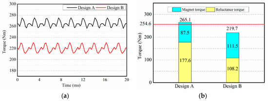 By using the maximum torque per ampere (MTPA) control, the performances of the two machines are obtained at the same rated speed of 450 r/min. The torque waveforms are shown in Figure 11a. The magnet and reluctance torques are shown in Figure 11b. The average value and torque ripple of the two machines are listed in Table 6. It can be seen that, with the same rated current, 30 A (peak), the maximum torque of Design B (219.7 Nm), is much less than the required rated torque (254.6 Nm), while Design A can offer enough torque (265.1 Nm). What is more, the torque ripple of Design A is less than that of Design B. At this operating point, the reluctance torque of Design A is much more than that of Design B, as shown in Figure 11b, which results in different output capacities for the two different designs. The inductance saliency ratio ξ is defined as: