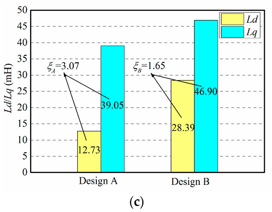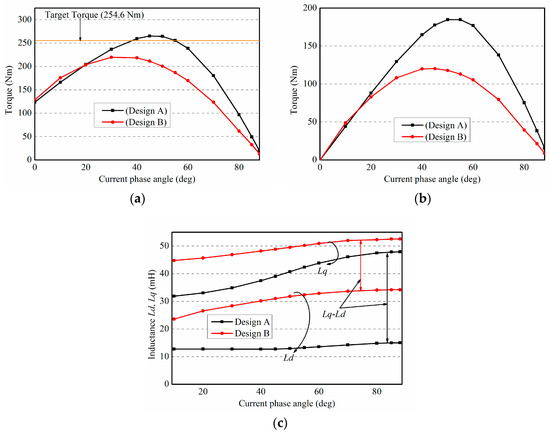 In Figure 12c, it can be seen that both Ld and Lq increase with the increase of the current phase angle for both Design A and Design B. This is to say that the rated current, 30 A (peak), induces significant saturations both in d-axis and q-axis magnetic roads in the two machines. Furthermore the saturation level of Design B is much higher than Design A, so the increment of Lq in Design B is smaller than it in Design A, thus resulting in a smaller difference between Lq and Ld in Design B, as shown in Figure 12c. Therefore, the maximum of reluctance torque provided by Design B is significantly lower than that provided by Design A, as shown in Figure 12b. With the same rotor, ampere turns, and similar winding factor for Designs A and B, the magnet torques of the two machines are almost the same. So, Design A can produce higher total torque under a maximum torque per ampere (MTPA) strategy with the same rated current, as shown in Figure 12a.