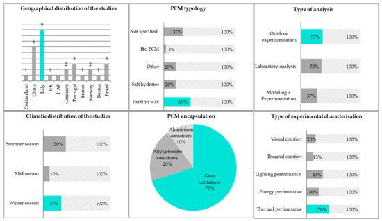 The literature review was based on a total of 30 papers, published between 1997 and 2018, related to experimental analyses of PCMs in transparent building envelope components. The analysed works were published in peer review journals and conference papers. The review analysis was restricted to only experimental research which presented the results of experimental in-field campaigns and to laboratory tests carried out on transparent technology prototypes with PCM. The investigated features are represented in Figure 1 and the percentages refer to the total number of studies, that is, 30 (thus representing 100%):