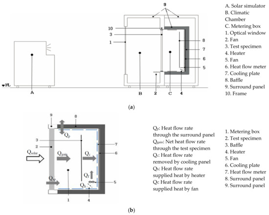 Solar Heat Gain Coefficient (SHGC) test rig [10]. (a) SHGC measurement apparatus; (b) Principle of solar heat gain measurement.