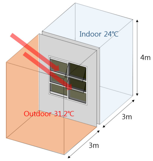 A radiation model was applied to analyze heat gain due to solar heat. In addition, a solar load model was used for the consideration of solar incidence angles and window opening effects. The CFD model to which the radiation model was applied presents a three-dimensional shape, as shown in Figure 2. This separates the window front and back side adjacent spaces into indoor and outdoor spaces with a rectangular polyhedron shape.
