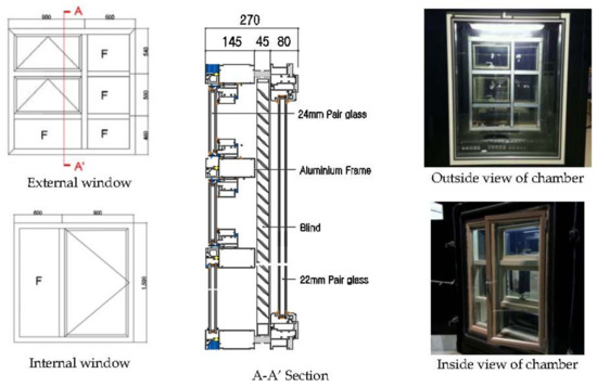 A specimen of SDSW was manufactured for a KS L 9107 test. As shown in Figure 3, the test specimen is a double-skin curtain wall aluminum window, which has a width of 1.5 m, a length of 1.5 m (due to the limit of the chamber size), an area of 2.25 m2, and a breadth of 270 mm.