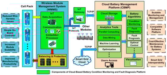 BMS can be revolutionized as a result of further investigation of the Internet of Things (IoT) technologies [] and cloud computing resources [] to identify battery cell’s health condition and to enhance scalability, cost-effectiveness, adaptability, safety, reliability, and flexibility of the large-scale Li-ion BESSs. Recently, a cloud connected battery management system for small EVs [] and cloud battery data analytics services to accelerate battery product development [] have been developed. However, the actual investigation of IoT and cloud computing to design a cyber-physical BMS platform for the large-scale Li-ion BESSs has been less studied.