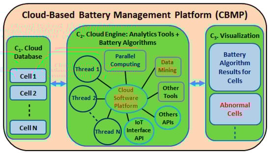 C2 employs: (1) the high-performance parallel computing that executes multithreads of the high computational battery algorithms to monitor a large number of battery cells very fast; (2) data mining to find abnormal battery cells from the outcomes of condition monitoring algorithms for fault diagnosis (e.g., outlier detection []); (3) machine learning for fault prognosis (e.g., support vector machine); and (4) optimization tools for optimal power management (e.g., Google optimization tools (OR-Tools)) given health conditions and demand of smart grid. Additional analytical tools offered by the cloud service providers will be easily incorporated in the cloud software platform through APIs.
