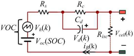 where y(k) = Vcell(k), x(k + 1) = [SOC(k + 1), Vd(k + 1), vh(k + 1)]T is the state, k is the time index, Vcell(k) is the measured cell terminal voltage, η is the Coulomb efficiency (assuming η = 1); Ctot denotes the total capacity of the battery cell [], Ts is the sampling period; iB(k) is the instantaneous cell current (iB is negative if the cell is operated in the charge mode); Vhmax represents the maximum hysteresis voltage; α = exp(−Ts/τ) with τ = Rc·Cd; β = Rc(1 − α); sign(∙) is the sign function; and H(iB) = exp(−ρ|iB|Ts), where ρ is the hysteresis parameter characterizing the convergence rate; and aj (j = 0, ∙∙∙, 5) are the coefficients used to parameterize the Voc(SOC) function. To simulate a micro shorted cell, a short circuit resistor Risc [] will be included, as shown in Figure 4.