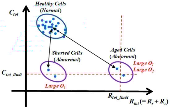 Fault diagnosis mainly detects abnormal cells (i.e., shorted cells or anomaly aged cells) that will be faulted very soon, which are more practically useful in the battery systems. Any detectable abnormalities in the measurements (e.g., cell voltage and current) and condition monitoring results (e.g., states SOC, Vc, and Vh, and parameters Ctot, Rs, and Rc) will be good indicators of fault diagnosis algorithms. Figure 6 shows a clustering analysis of healthy cells, shorted cells [], and anomaly aged cells (i.e., almost dead cells) [,] using estimated parameters Ctot and Rtot (=Rs + Rc). Since the shorted cells and aged cells have high abnormalities of Ctot and Rtot compared to those of normal cells, two parameters are considered as good outlier values in the proposed method.