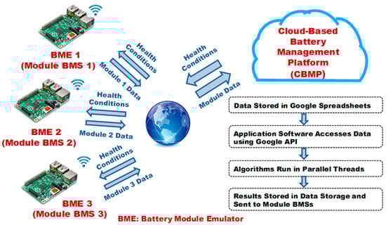 Figure 7 illustrates the developed small-scale cloud-based BMS simulator which includes a CBMP and three battery module emulators (BME)s. The BME is designed with Raspberry pi board (i.e., an IoT device) and stores module data (i.e., battery cell voltage and current data generated by ten battery cell simulation models in Figure 3). The BMEs send the module data to Google spreadsheet (i.e., a cloud database in Figure 1) via internet, where Google sheet API embedded in the BME enables the data to be stored/synchronized in Google spreadsheet. Google App engine (i.e., an analytics tool in Figure 1) executes multithreads of the HF-based condition monitoring algorithms and the fault diagnosis algorithm written in Java for individual cells using parallel computing in the Google Cloud. The health monitoring results are stored in the Google spreadsheet, and then the health conditions are sent to module BMSs via internet and user can observe the results in the Google spreadsheet and visualization tools.