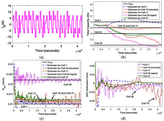 Comparison of true and estimated values of Cell 1, Cell 10 (shorted), Cell 11, Cell 20 (aged), and Cell 21 from the condition monitoring in Google cloud: (a) input current profile; (b) Ctot; (c) Rtot; and (d) state of charge (SOC) estimation error.