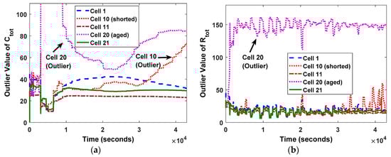 The estimation results of total capacity Ct, total resistance Rt, and SOC values of Cell 1 in BME 1, Cell 11 in BME 2, and Cell 21 in BME 3 are validated. The results are shown in Figure 8. Figure 8b–d depict the comparison of true capacities, resistances, and SOCs of the battery cell models with the estimated values from the HF-based condition monitoring algorithm in Google cloud. The results show that the HP method converges to the true values and accurately estimate capacities, resistances, and SOCs individual battery cells except for the shorted cell. Since the battery model used in the HP-based condition monitoring does not consider the Risc, the estimation errors of the shorted cell are larger than others. However, this is beneficial to detect the shorted cell because the larger estimation error adds more abnormality to the outlier detector of the proposed outlier mining-based fault diagnosis algorithm. Figure 9a,b illustrate the outlier values of the total capacities and resistance of the batteries computed by the proposed outlier mining-based fault diagnosis algorithm using the estimated Ctot and Rtot values. The results show that Cell 20 (aged cell) has significantly large outlier values O(Z1) and O(Z2), while Cell 10 (shorted cell) only has significantly large O(Z1). Therefore, the proposed fault diagnosis algorithm can provide online fault detection and classification of the individual batteries.