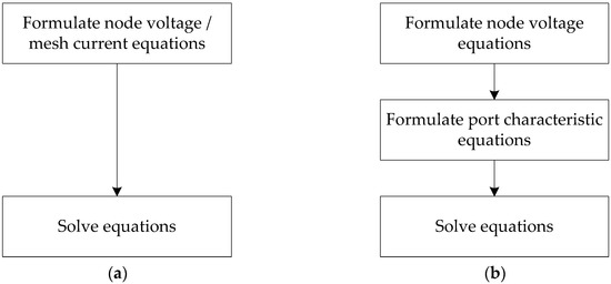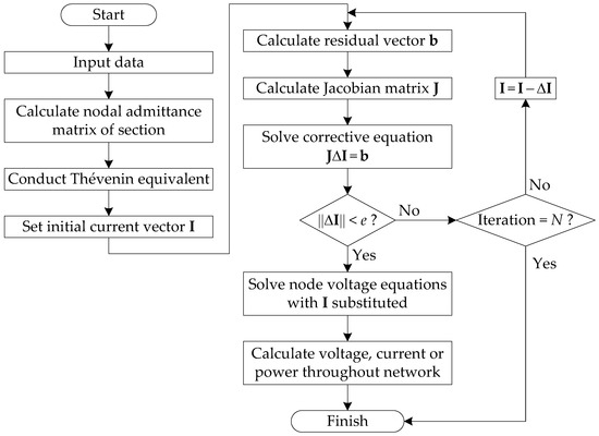 - Node voltage equations are converted into port characteristic equations according to the Thévenin equivalent. The Newton-Raphson method is exploited to solve those equations, which has faster convergence than the MNFA. Besides, it has an easier approach to multiple solutions than the CPF.