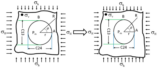 where: r is original borehole radius; R is the distance from borehole center; μrr is the displacement of the borehole at R distance from the borehole center; is Young’s modulus; is Poisson’s ratio; is vertical stress; is maximum horizontal stress; is minimum horizontal stress; Pm is borehole mud pressure; θ is the angle from maximum horizontal stress direction.
