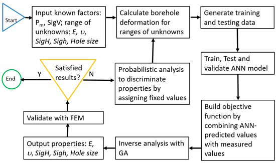 However, because of the large number of unknown parameters, more than the number of equations, there could be multiple combinations of in-situ stress, geomechanical parameters and borehole size that all lead to the same borehole deformation. To solve this dilemma, we adopted the probabilistic analysis for a number of realizations of the ANN-GA model. After each probabilistic analysis, the obviously higher frequency value for certain parameters will be identified. Then the specific values for these parameters will be chosen to be locked, and thus the total number of unknown parameters will be reduced for the next-run of ANN-GA model. The process is repeated until satisfied results are achieved with sufficient clarity. The final results will be further validated by finite element method to verify the relationship revealed by the ANN-GA model. We name this repeated probability analysis process as probabilistic recapitulation (PR). The work flow for the PR-ANN-GA method is shown in Figure 2.