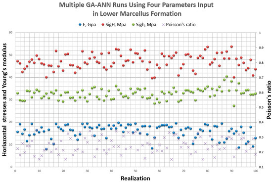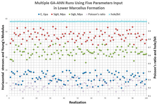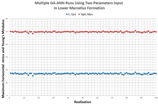 Results of Young’s modulus and maximum horizontal stress of 100 realizations of GA-ANN model with fixed.