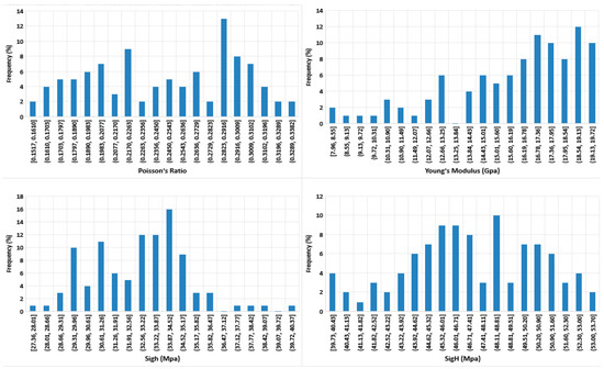 Histogram of Poisson’s ratio, Young’s modulus, minimum horizontal stress and maximum horizontal stress of 100 realizations of four parameters GA-ANN.