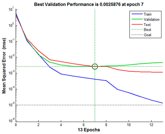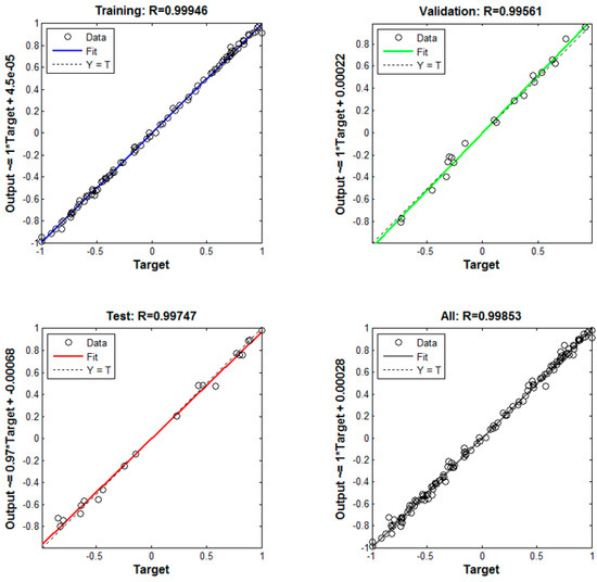In order to verify each ANN model, the mean-square error (MSE) is used to evaluate the convergence of ANN. Figure 8 shows the MSE variations for training, validation, and testing with iterations. The best validation performance is 2.59 × 10−3. Figure 9 shows the linear regression between the modeled output and the corresponding target. The regression values are shown on the top of pictures of training, testing, validation, and all samples respectively. All of the regression values are greater than 0.99, which meant very good performance.