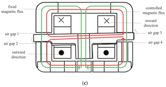 In Figure 2b, however, the two coils are energized with the same current input. The power supply goes out of the paper for the upside of the windings and returns into the paper for the downside, forming a closed current loop. Both coils produce a magnetic flux going through two parallel ways, that is, one from the armature to the upper iron, returning to the armature, and the other from the armature to the lower iron block, returning to the armature. The magnetic flux produced by the coils is superposed with that by the permanent magnets. The resulting magnetic flux at air gaps 1 and 4 is enhanced as a result of the same direction of the flux by the magnet and coil, whereas it is weakened at air gaps 2 and 3 as a result of the opposite direction of the flux by the magnet and coil. Therefore, the attraction force at air gaps 1 and 4 is larger than that of 2 and 3, which causes the armature to rotate clockwise. Similarly, if the current input in the two coils reverses the direction, as shown in Figure 2c, the superposition of the magnetic flux leads to the anticlockwise rotation of the armature. The continuous current switch leads to reciprocating motions of the armature. The opening and closing of the servo valve is dependent on the armature motion and thus the direction of excitation current, and the opening angle of the servo valve can be controlled by the value of the excitation current.