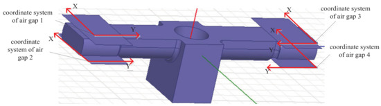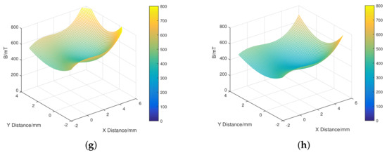 The analysis of the magnetic field distribution in air gaps of hydraulic torque motors has been done by other researchers previously. However, for simplification, these analyses generally assume an evenly distributed field in the air gaps, and the influence of the limiting hole in the air gap is ignored. In this study, to analyze the magnetic field distribution comprehensively, the influence of limiting holes is included. One coordinate system is established as shown in Figure 3. The -plane of the coordinate system is in the middle position of the air gap. The numerical result of the magnetic field distribution with respect to the x and y coordinates in the four air gaps is presented in Figure 4. Figure 4a,c,e,g represents the flux field status of the motor without a power supply, and the rest of the figures represent the flux field status with a 10 mA current input.