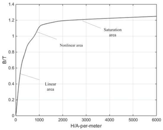 Magnetic saturation is a common characteristic of magnetic materials [18,19]. In most cases, we hope that the magnetic flux density can increase with respect to the magnetic field strength. However, in practice, the magnetic flux density does not continue to increase proportionally after reaching a certain value. This indicates that the magnetic flux is saturated at this point. In general, a magnetic material is characterized by a curve, as illustrated in Figure 5. The curve can be divided into three parts, that is, linear, nonlinear and saturation regions. In general, the magnetic material works in the linear region. When the flux density reaches about 0.7 T, the iron block begins to enter the nonlinear region. Once the magnetic flux density reaches about 1.2 T, the iron block is saturated seriously. In this situation, the system’s working efficiency may be decreased significantly. Therefore, it is important to analyze the magnetic saturation in the iron blocks of the torque motor.