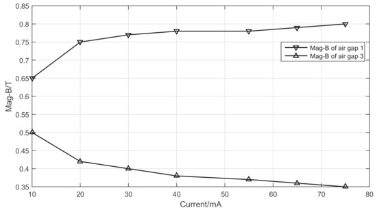 The increase in the excitation current in the coils changes the magnetic flux density in the air gaps. The relationship between the excitation current and the magnetic flux density of air gaps 1 and 3 has been analyzed numerically and is presented in Figure 6. This indicates that the magnetic flux density does not change greatly after the current input reaches about 40 mA, that is, when the iron block goes into the saturation status. We can also find that the iron block enters the non-linear working region when the current input reaches about 20 mA. The result can help us to determine the reasonable range of power supply for the motion control of the torque motor, that is, 20 mA for this motor design.