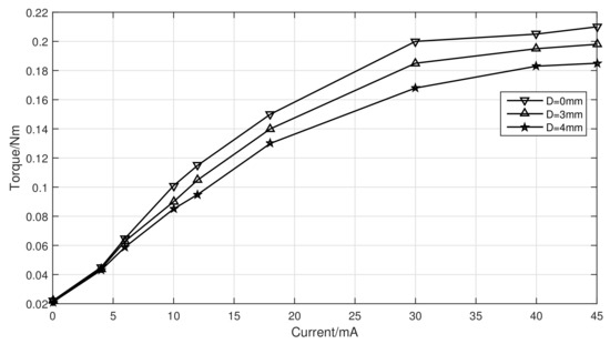 The relationship between the current input and torque output with respect to different sizes of limiting holes has been analyzed, and the result is presented in Figure 8. In general, the torque output is directly proportional to the current input. However, when the excitation current is larger than a certain value, the torque output no longer increases directly proportionally. This is mainly caused by the magnetic saturation in the motor. For example, the directly proportional relationship only applies to the third curve in Figure 8 (D = 4 mm) when the current input is less than about 18 mA. This result is consistent with the magnetic field analysis in the last section.