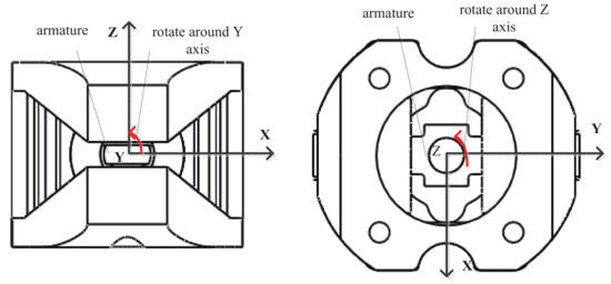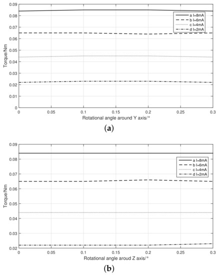 One typical assembly error is the rotational error; that is, the armature has an initial rotational angle about the Y or Z axis of the coordinate system, as indicated in Figure 9, and it is about 0– according to experience. The influence of the rotational assembly error on the torque generation is shown in Figure 10. To observe the effect comprehensively, a different current is supplied into the coils. It is found that the influence of the rotational assembly error on the torque generation is ignorable, regardless the current input in the coils.