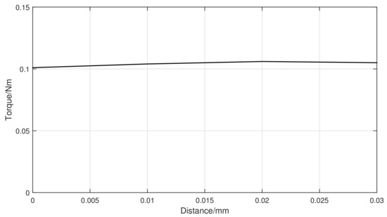 Besides the rotational assembly errors, the armature may move along the axis of the coordinate system a very short distance, causing the displacement assembly error. We assume that the armature moves a small distance along the Z axis, which changes the thickness of the air gaps. The influence of the displacement assembly error on the torque generation has been analyzed, and the result is shown in Figure 11. It is found that within a certain displacement, such as 0–0.03 mm, the influence of the assembly error on the torque output is not significant.