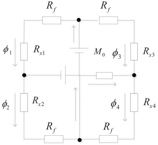 As shown in Figure 12, there are two independent closed magnetic circuits in the torque motor. For each of these, similarly to the electric circuit, Kirchhoff’s law can be used to solve the magnetic flux in the magnetic circuit as follows: