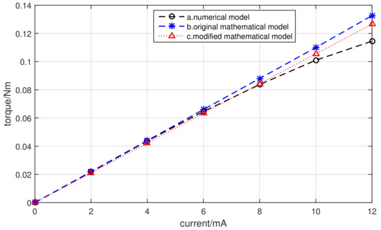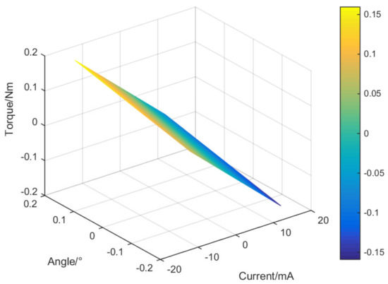 In the numerical simulation, the current input and rotational angle changed value continuously, and thus the corresponding torque output could be obtained. The relationship between the torque output, current input and rotational angle is presented in Figure 13. Through a curve fitting approach, it has been found that when the armature is at the initial position, the torque output shows good symmetry. When the direction of the current is reversed, the torque output also reverses. The torque output is directly proportional to the rotational angle and the current input, which is consistent with the analytical model.