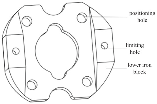 where is the magnetic reluctance of the iron block by considering the influence of the limiting holes. The diameter of the limiting hole is about 2 mm, and the diameter of the positioning hole is about 4 mm. The cross-sectional areas of the limiting holes and positioning holes should be subtracted from the area of the block iron along the magnetic circuit, as shown in Figure 14.