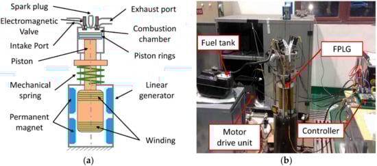 A free-piston linear generator is a novel energy converter which normally consists of an internal combustion engine (ICE), a linear electric machine (LEM) and a rebounding device [1,2]. The hybrid electric vehicle equipped with this energy conversion device can increase the runtime or reduce the demand of charging. Compared with the conventional internal combustion engine, due to the elimination of the crankshaft and flywheel of ICE, the piston of the ICE and the mover of the linear generator are directly connected [3,4,5]. Therefore, the piston is free to oscillate between the top dead center (TDC) and the bottom dead center (BDC) without the limitation of the crankshaft mechanism. This brings the ability to accommodate multi-fuel by easily controlling the compression ratio without modifying the mechanical structure. The energy conversion efficiency can be increased with optimizing the compression ratio [6,7,8,9]. Furthermore, the key performances of FPLG, the output power and system efficiency could be improved by controlling the motion state of the piston [10,11].