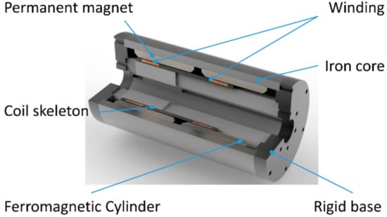 The main structures of the LEM are described in Figure 2. The LEM is a single-phase moving-coil permanent magnet motor/generator, also called a voice coil motor (VCM). The windings are inserted into a nylon cylinder to achieve light moving mass and fast dynamic response. The permanent magnets and wingdings have a symmetrical distribution in the metal housing. This design brings the advantage of producing the same forces by two ring-type wingdings [19]. The mover of LEM is connected to the piston of ICE and moves to and fro between TDC and BDC. In this paper, a moving-coil voice coil motor (VCM) is employed in the FPLG. The windings of the mover are inserted into a nylon cylinder without an iron core. Therefore there are no iron losses in the mover. Permanent magnets are assembled on the iron core in the stator. The iron losses of the stator have not been considered. The efficiency of the motor is 94%.