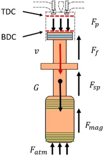 where, Fp is the pressure force of the combustion chamber, Fatm is caused by the atmospheric pressure, G is the gravity acting on the piston assembly, Fsp is the force generated by mechanical spring, Ff is the frictional force between the piston components and the linear guide, and Fmag is the electromagnetic force, M is the mass of the piston assembly, and the displacement between the piston and cylinder head is defined as for the purpose of describing the piston motion. The positive direction is defined to be from TDC to BDC, and the initial position of piston is near the TDC.
