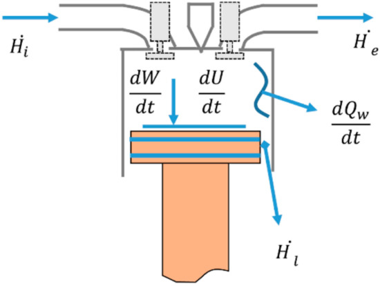 Figure 4 shows the in-cylinder energy flow. In ICE, the chemical energy is converted into heat energy when fuel is burnt. The in-cylinder pressure and temperature increase with the release of heat in the early stage of expansion process. On the basis of the first law of thermodynamics [6,31,34], the thermodynamic process in ICE can be described as: