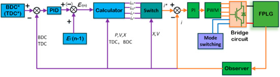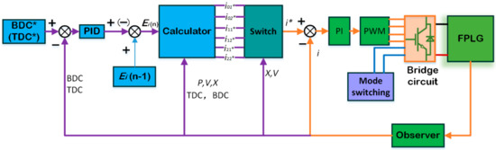 The control diagram is shown in Figure 7. The errors of the dead centers are fed back to the control loop to adjust piston motion. When the TDC error is positive, the in-cylinder pressure is higher than the set pressure and could result in a detonation combustion phenomenon. When the TDC error is negative, the in-cylinder pressure is insufficient to push the piston to BDC*. On the other hand, a large BDC error indirectly affects the TDC position accuracy. These two situations have an impact on the next cycle and steady power output. Therefore, according to the working conditions, the target currents are continuously regulated until the errors are within a suitable range. The calculation corresponds to (22)–(24), the current switching process is determined according to the piston velocity and displacement. At the same time, the mode switching can switch the state of FPLG between motor and generator based on the working conditions.