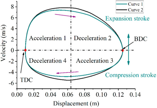 Figure 8 shows the phase trajectories of FPLG. They are obtained when FPLG is in stable operation with two different control strategies. The average velocity of Curve 2 is larger than that of Curve 1. The whole operation process could be divided into four stages, which are Acceleration 1, Deceleration 2, Acceleration 3 and Deceleration 4. The absolute values of the velocity gradually increase in Accelerations 1 and 3, and then drop in Decelerations 2 and 4. If the absolute values of the acceleration increase in these four stages, the average velocity of the piston will be improved, the curve 1 could be changed to curve 2 as shown in Figure 8. Especially, the cover area of the curve, which indicates the output power, will be increased accordingly.