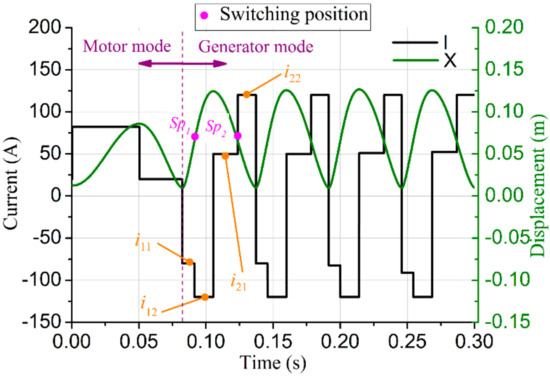 Figure 9 describes the relationship among the target currents, switching positions and piston displacement. In the operation of FPLG, if a large combustion fluctuation happens, it will cause the errors between the actual and target dead centers. These errors are employed to be a feedback signal to modify reference currents for achieving the stable operation. In this control strategy, when the piston cannot reach the target TDC (BDC), the reference currents of next compression (expansion) stroke will be reduced. On the contrary, the reference currents will be increased when the piston position overshoot the target dead centers.